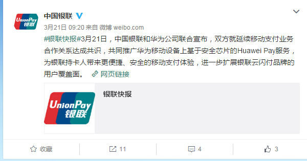 昨天,中國銀聯和華為公司聯合宣布,兩邊就連續移動付出事務協作關系達成共識,一起推行華為移動設備上根據安全芯片的Huawei Pay效勞,為銀聯持卡人帶來更快捷、安全的移動付出體會,進一步拓展銀聯云閃付品牌的用戶覆蓋面。